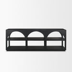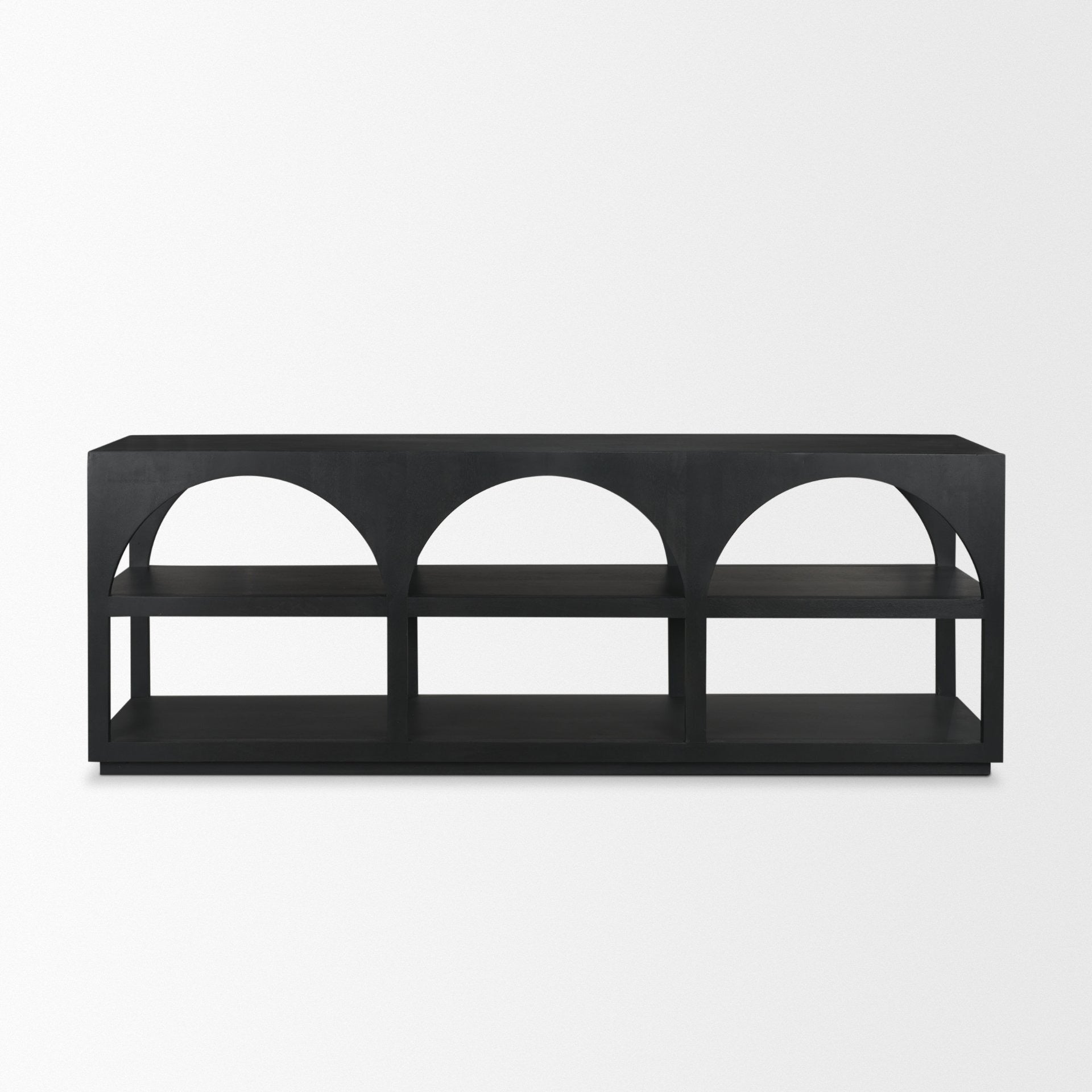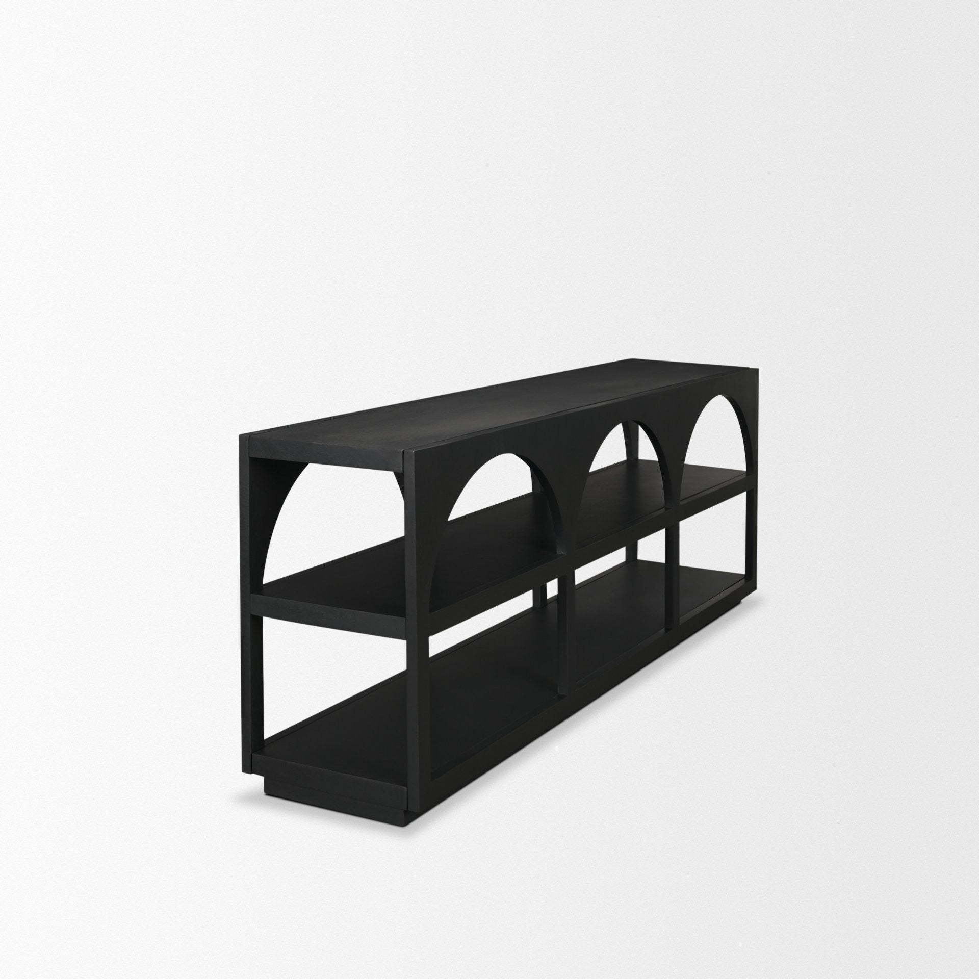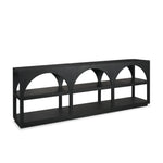 Bela Large Console Table is made of two, solid medium brown mango wood frames, featuring three arches with two open shelves.
