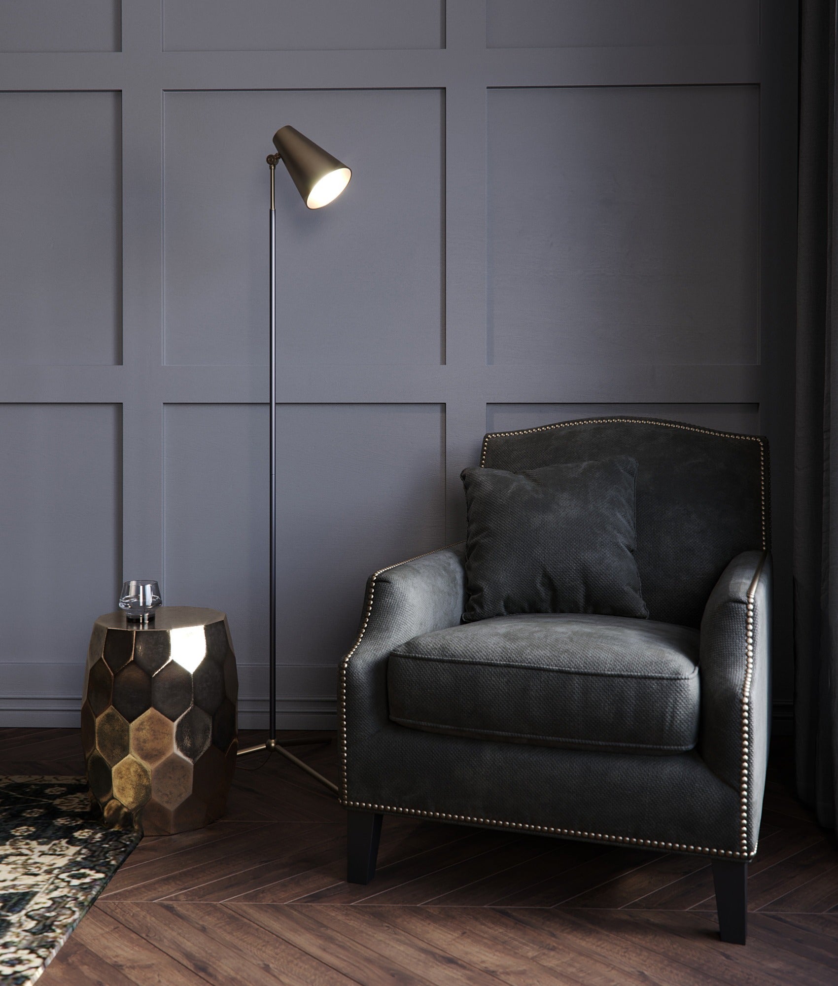 This tripod floor lamp is a modern take on a classic. The Antique Brass finish on the shade and base plays nicely with the Bronze finish on the stem, and the slender silhouette is approachably contemporary. Place this piece in a living room as a showpiece.