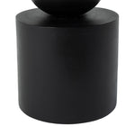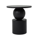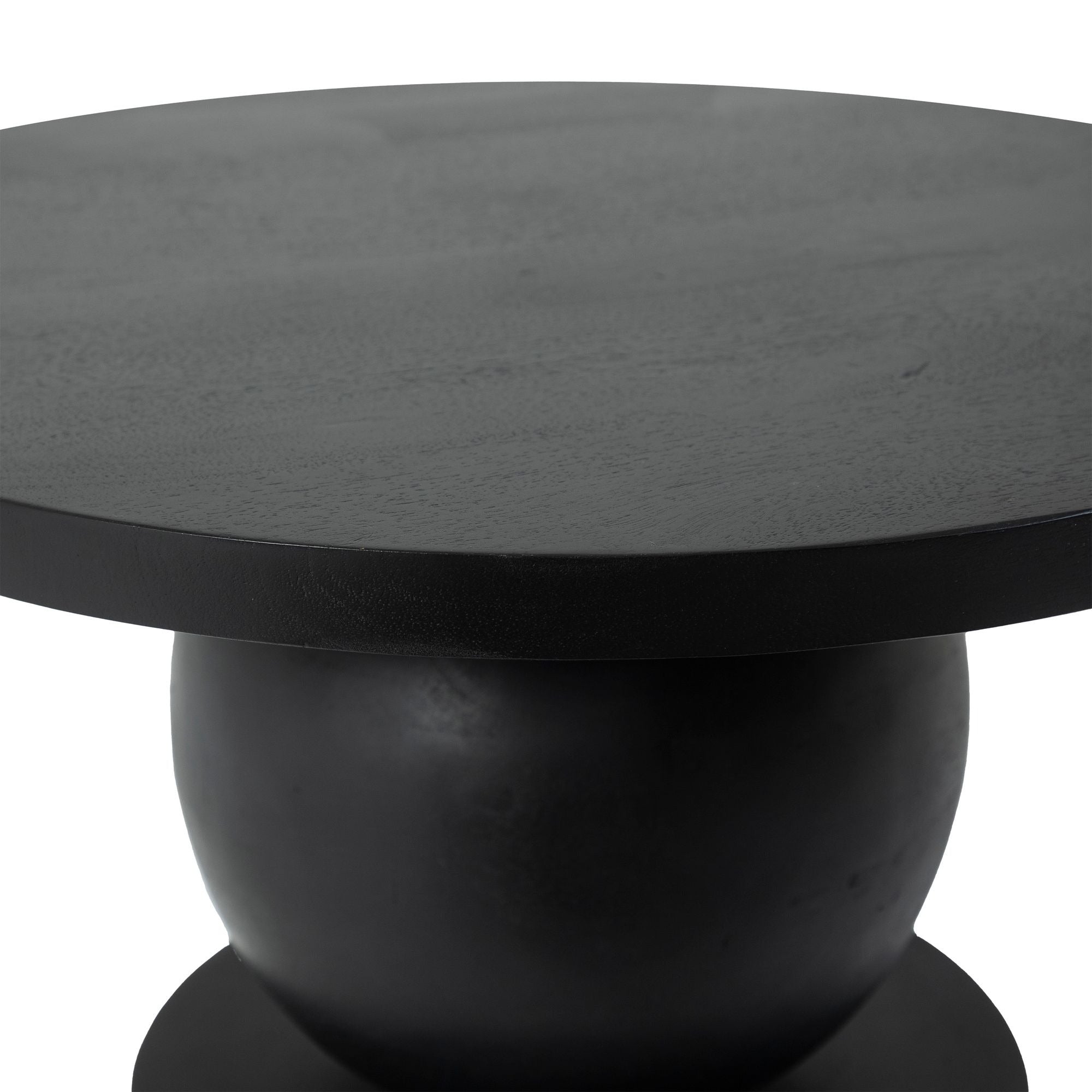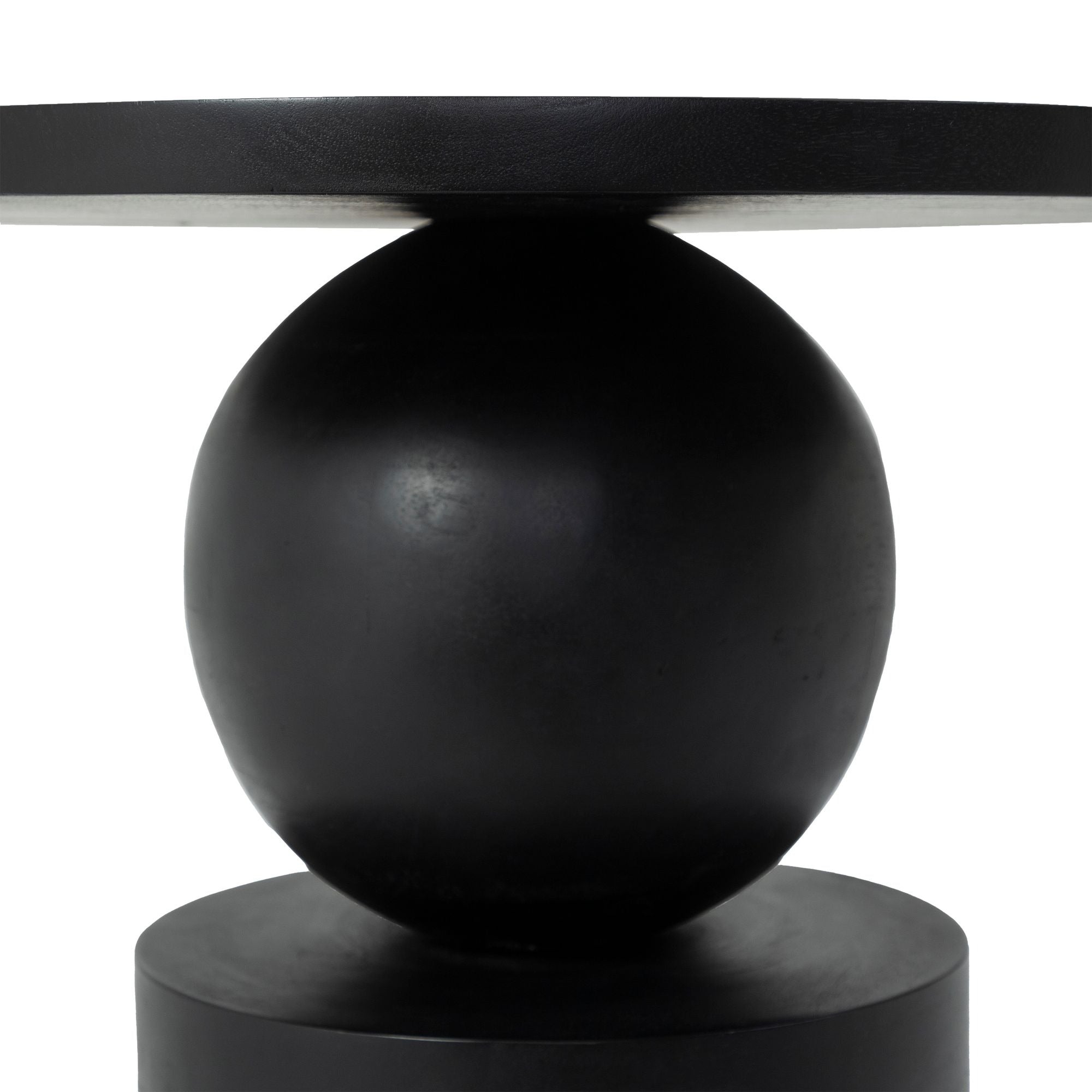 Striking the perfect balance between art and function, this sculptural side table makes a bold statement in any space. Crafted from solid mango wood and finished in a deep matte black, its geometric silhouette is both modern and timeless. The architectural form—featuring a round top, a spherical centre, and a sturdy cylindrical base—offers visual interest from every angle.