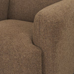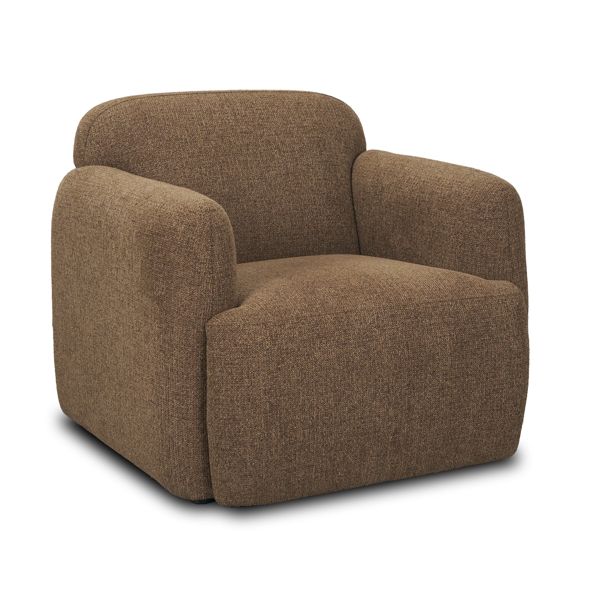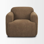 The Saga Upholstered Chair is enveloped in soft, thick textured mocha brown fabric that lends an heirloom appeal, featuring soft curves and an inviting, relaxed silhouette.