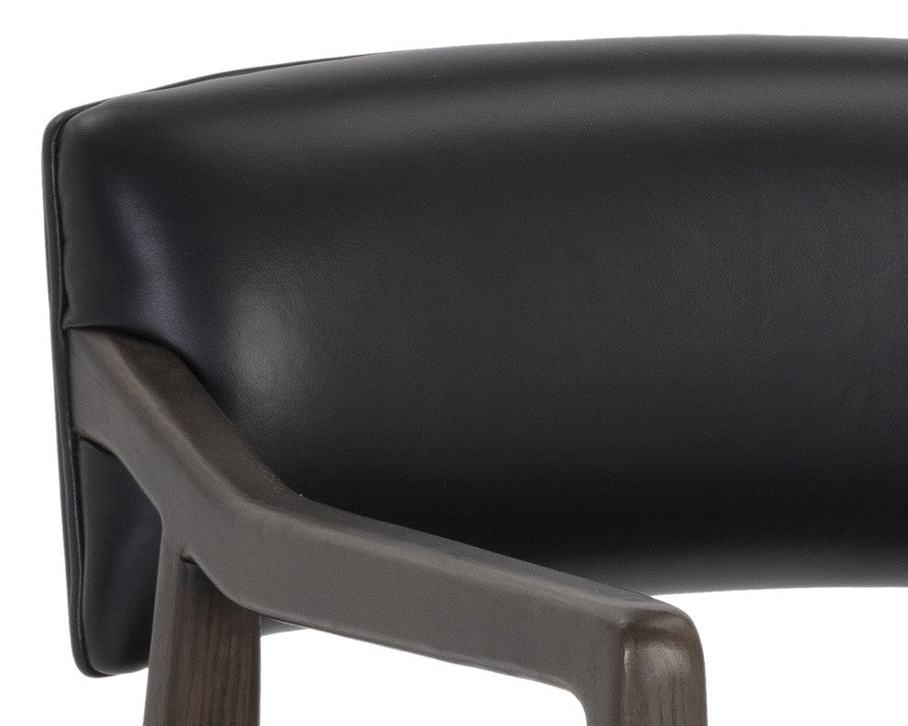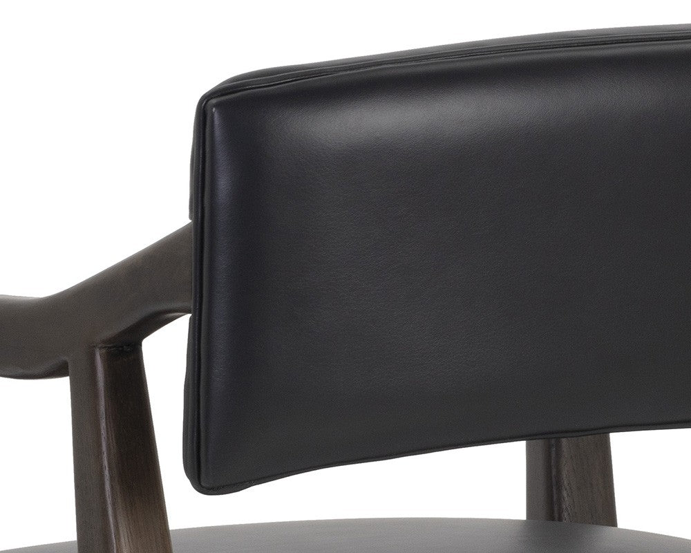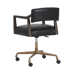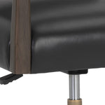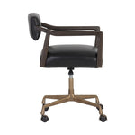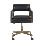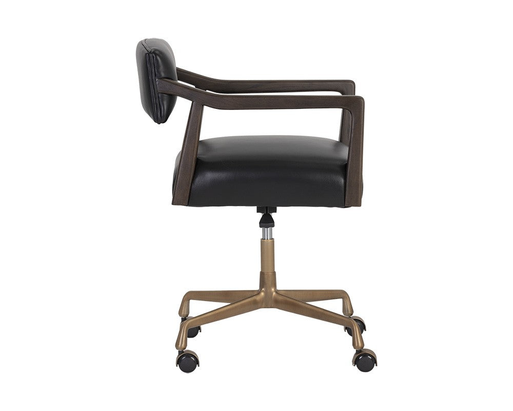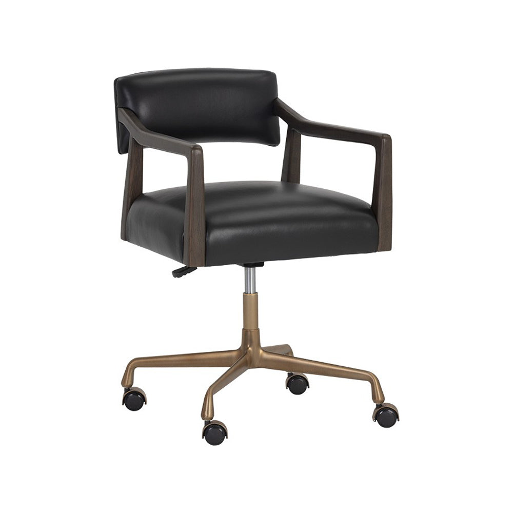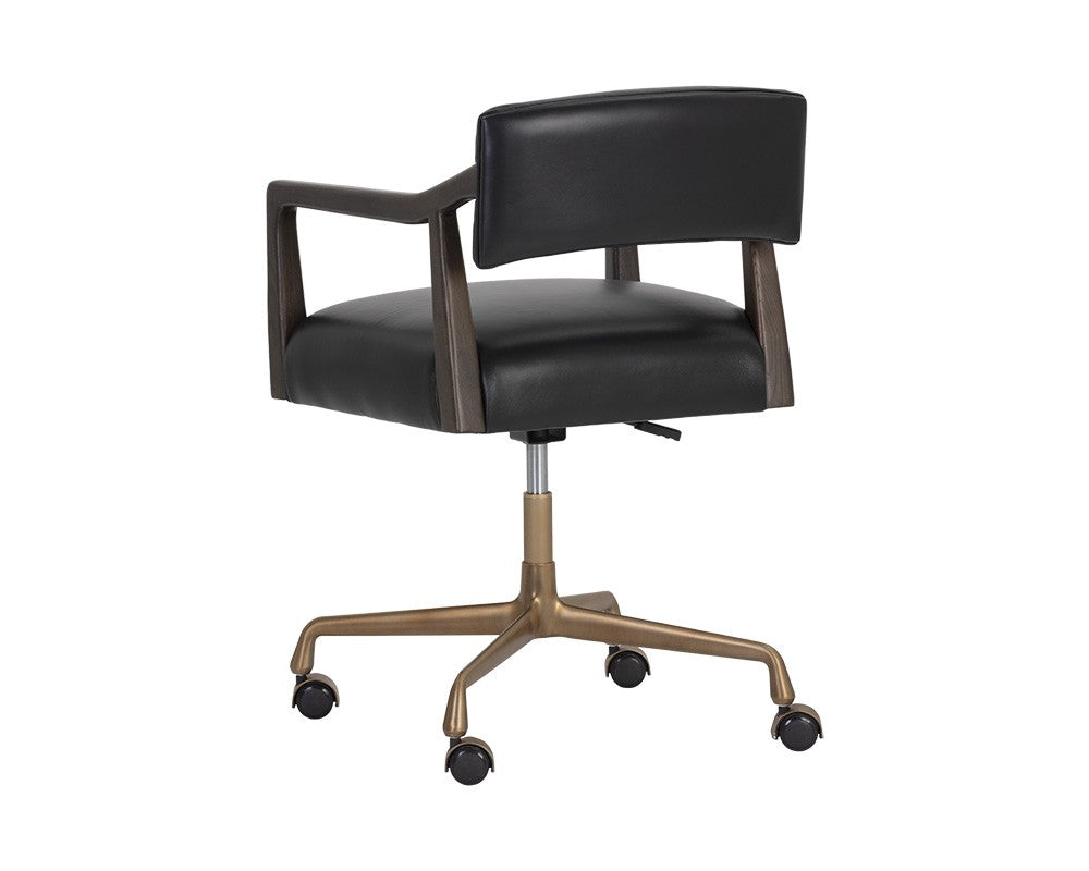 Design an inviting office space with the mid-century inspired Keye office chair. The exposed dark brown oak wood arms and bronze base offers an airy element while paired with genuine leather.