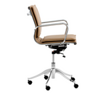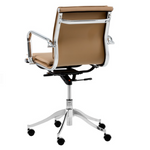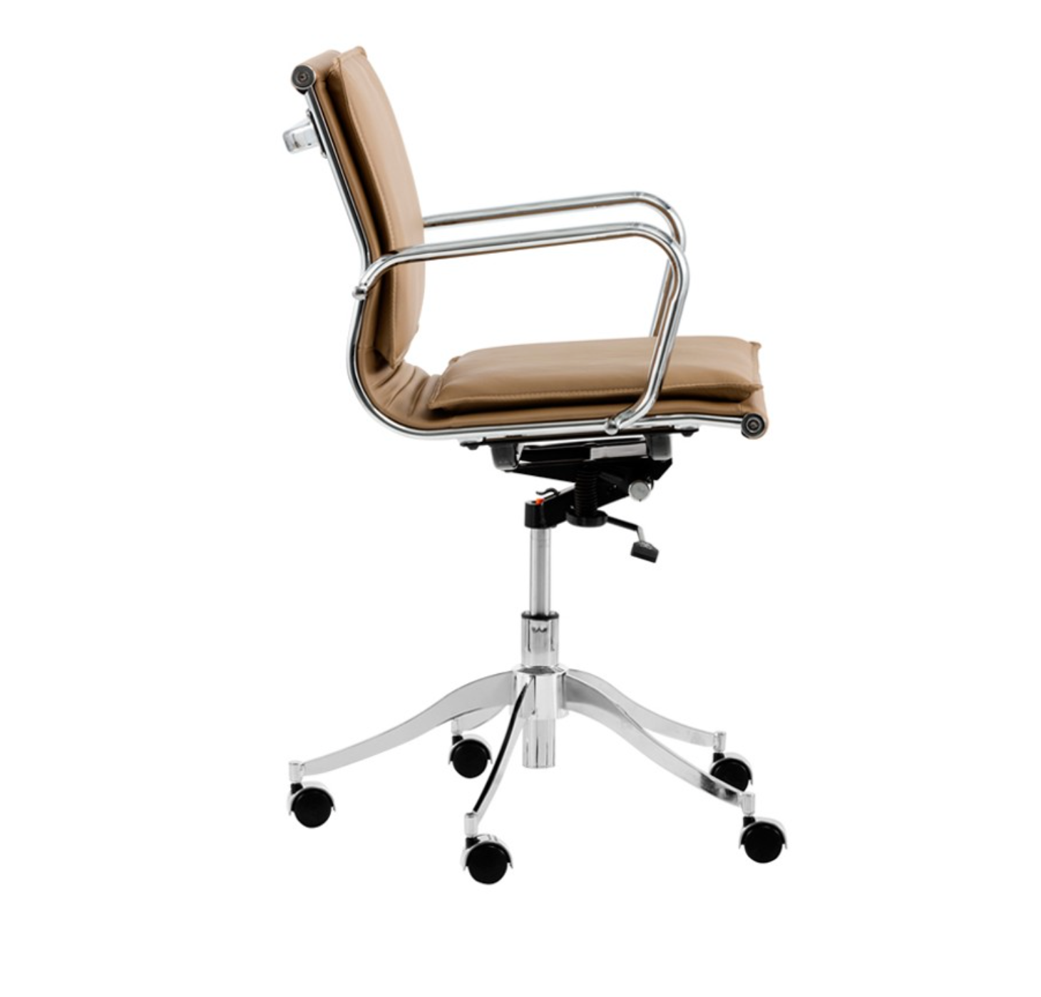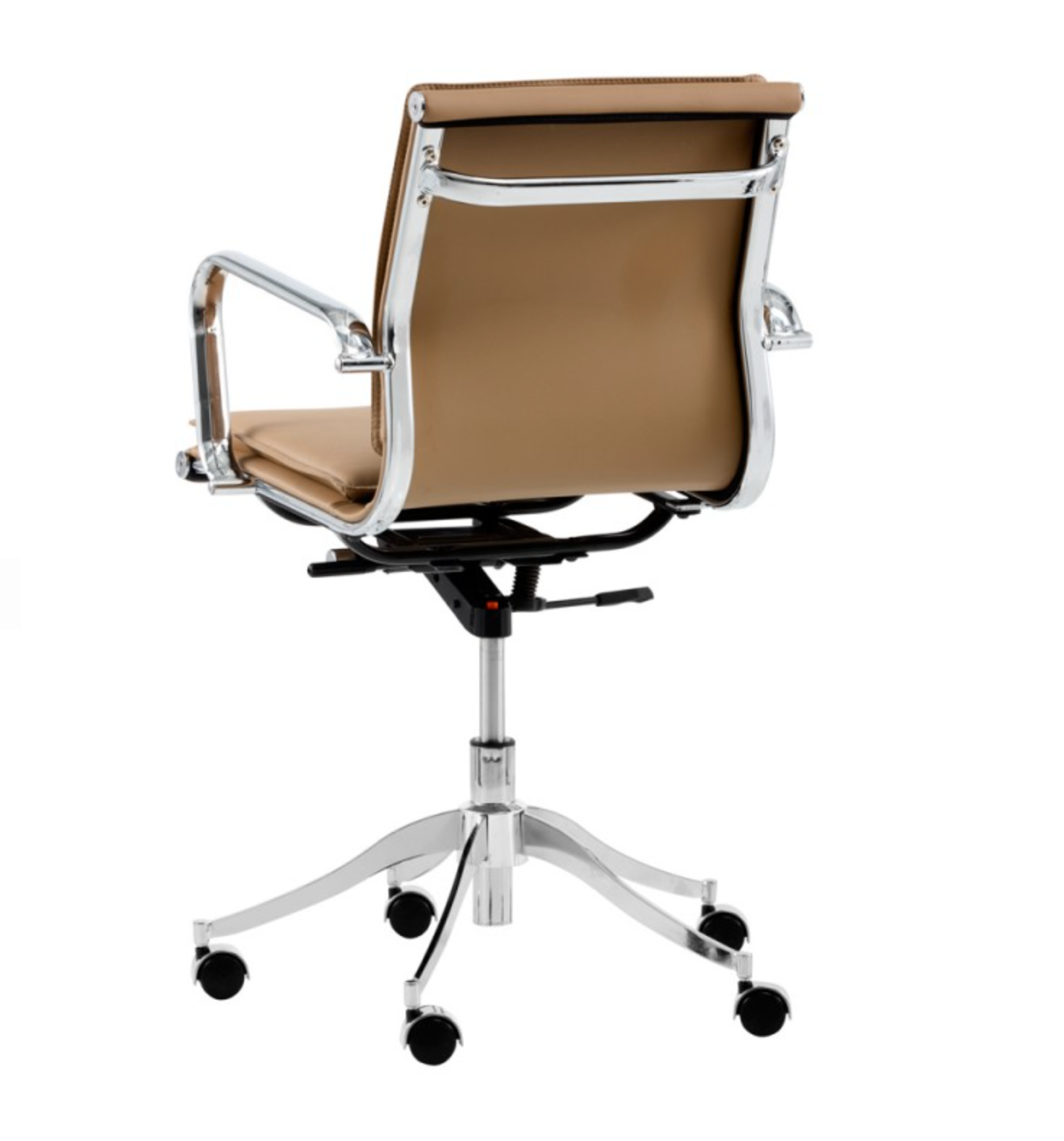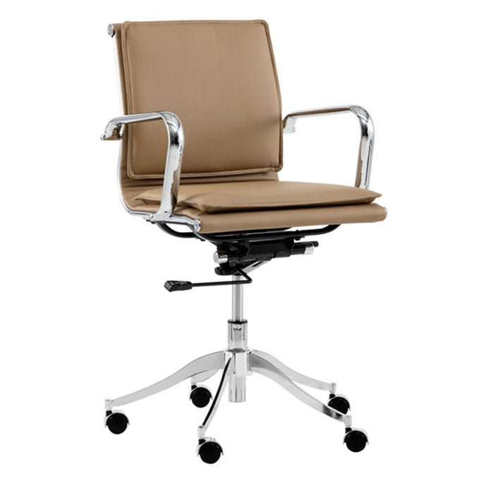 This home office chair sits comfortably with a padded seat and back in a tan faux leather. Finished with a stainless steel frame and castors for mobility.