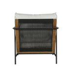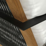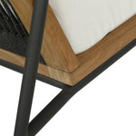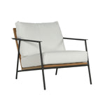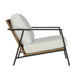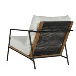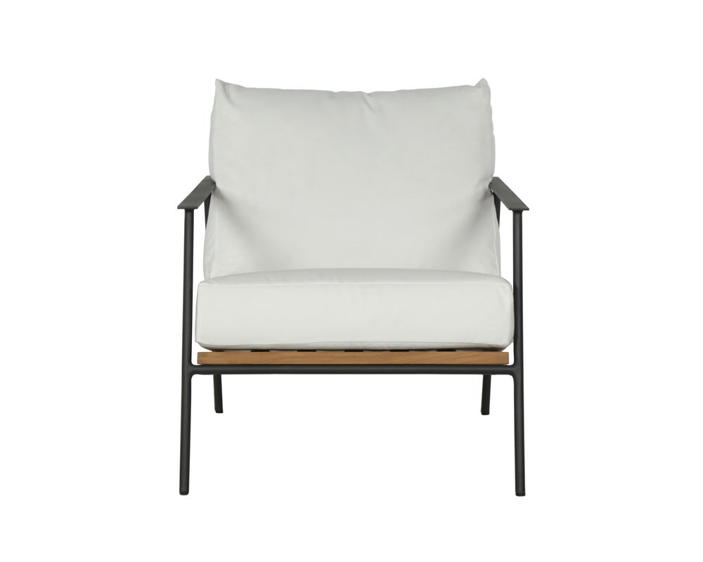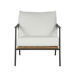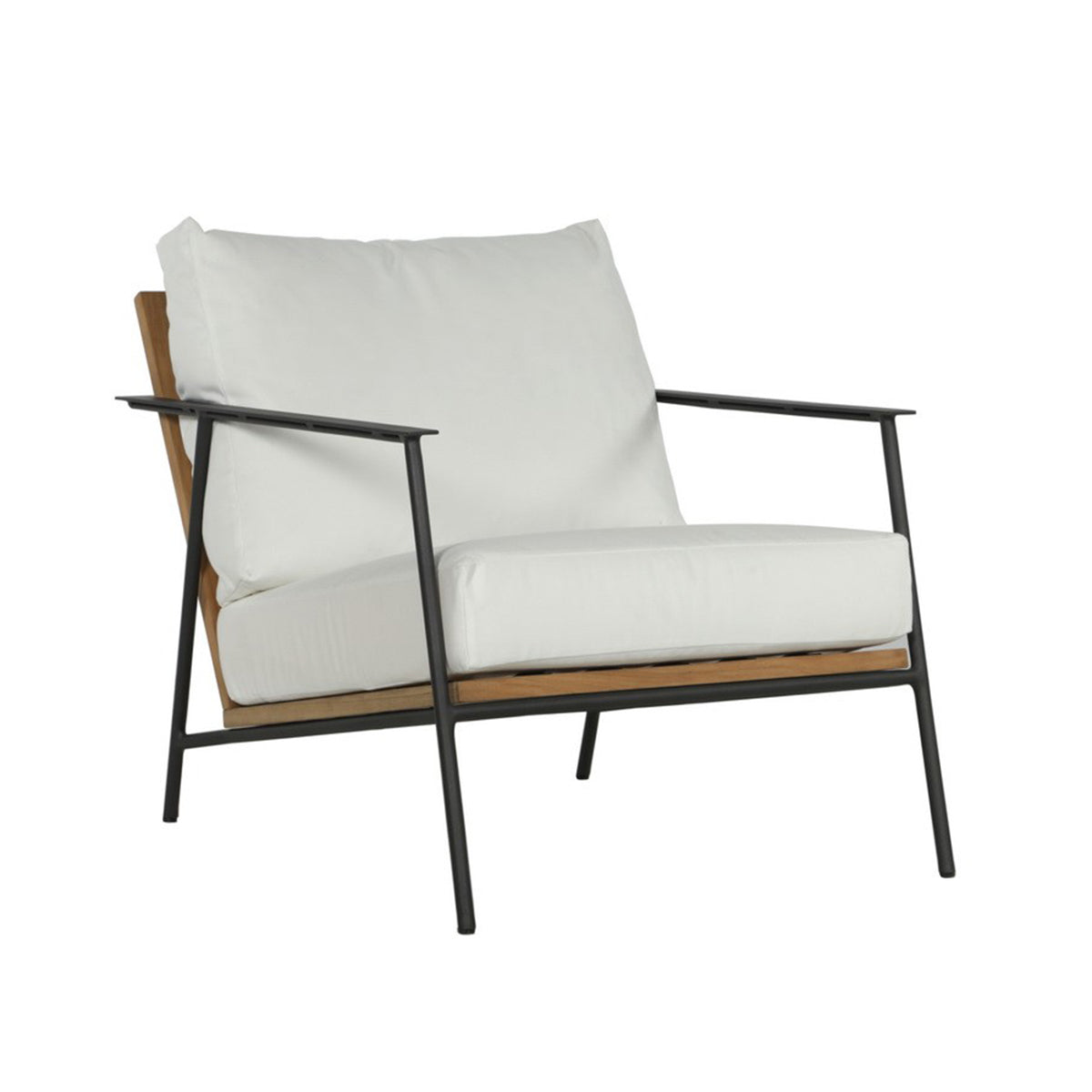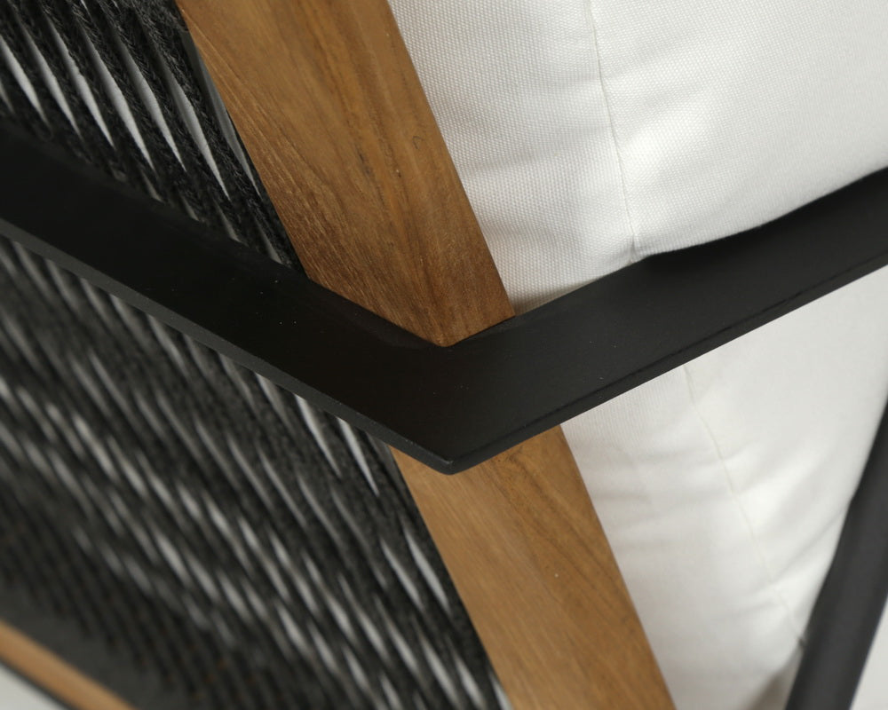 Create a distinguished outdoor lounge space with this modern armchair. Features a black powder-coated frame and graphite weave exterior, contrasted with a natural teak wood frame and regency white seat. The combination of mixed materials creates a clean look. Fabric offers extreme UV resistance and the frame is resistant to corrosion and weather hazards.