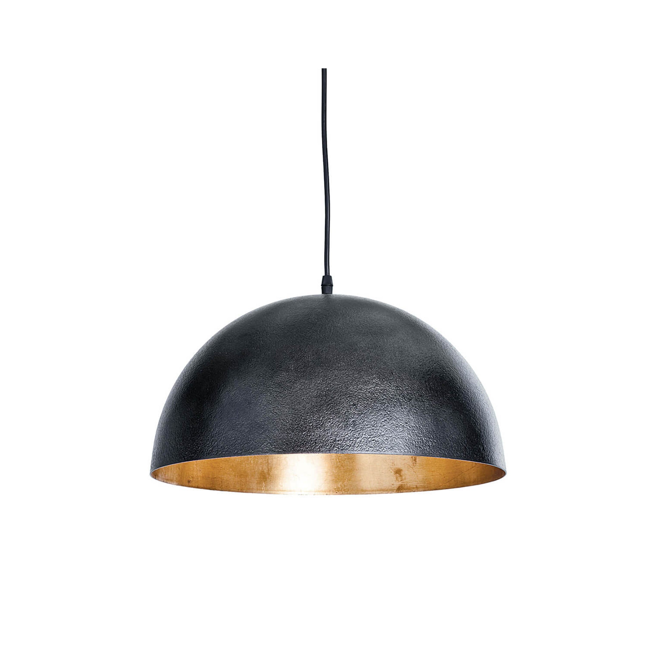 A simple dome shade brings sleek minimalism to the mix. Featuring a gold-leafed finish on the shade’s interior, this gives the room a warm glow and a sophisticated pop of contrast.