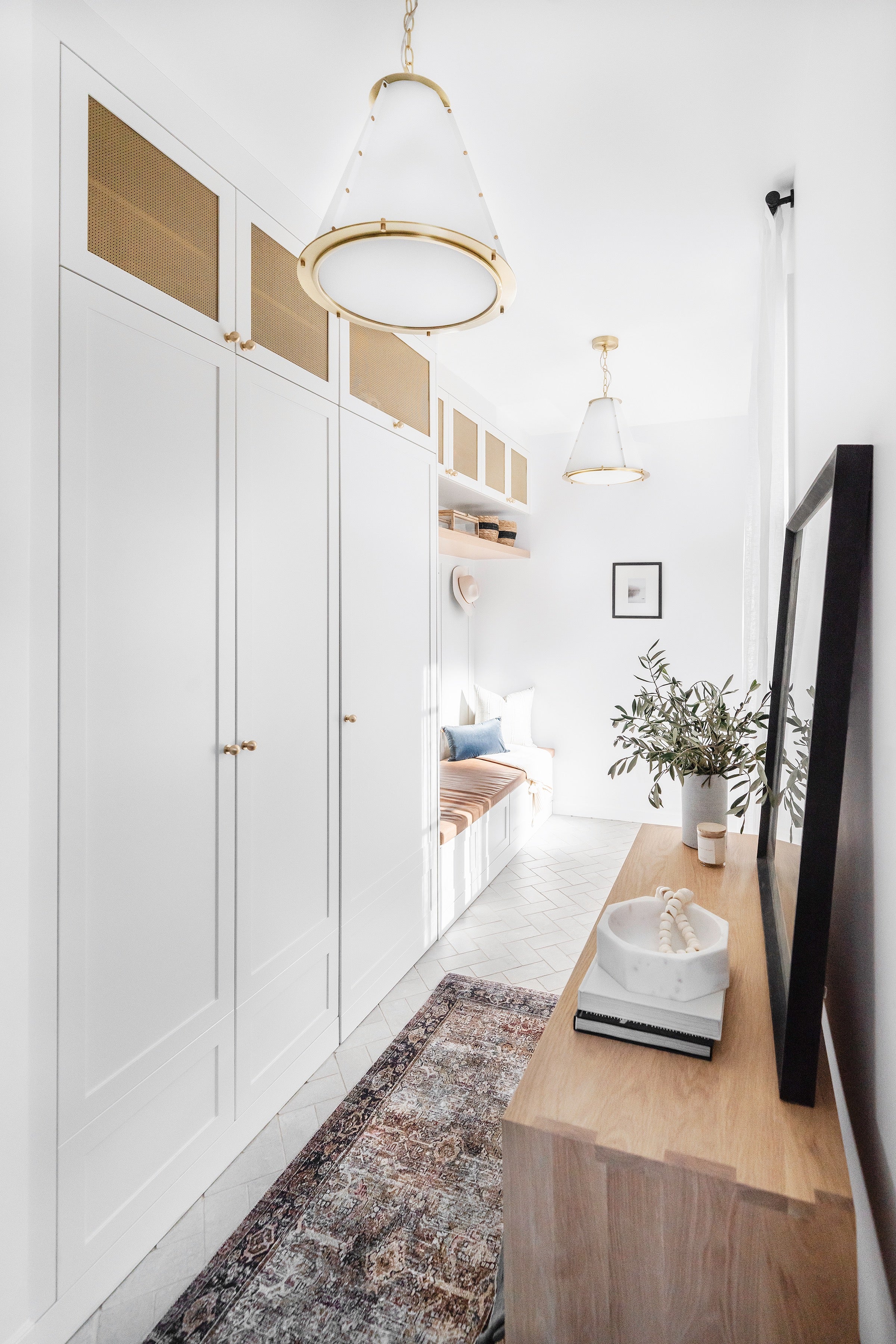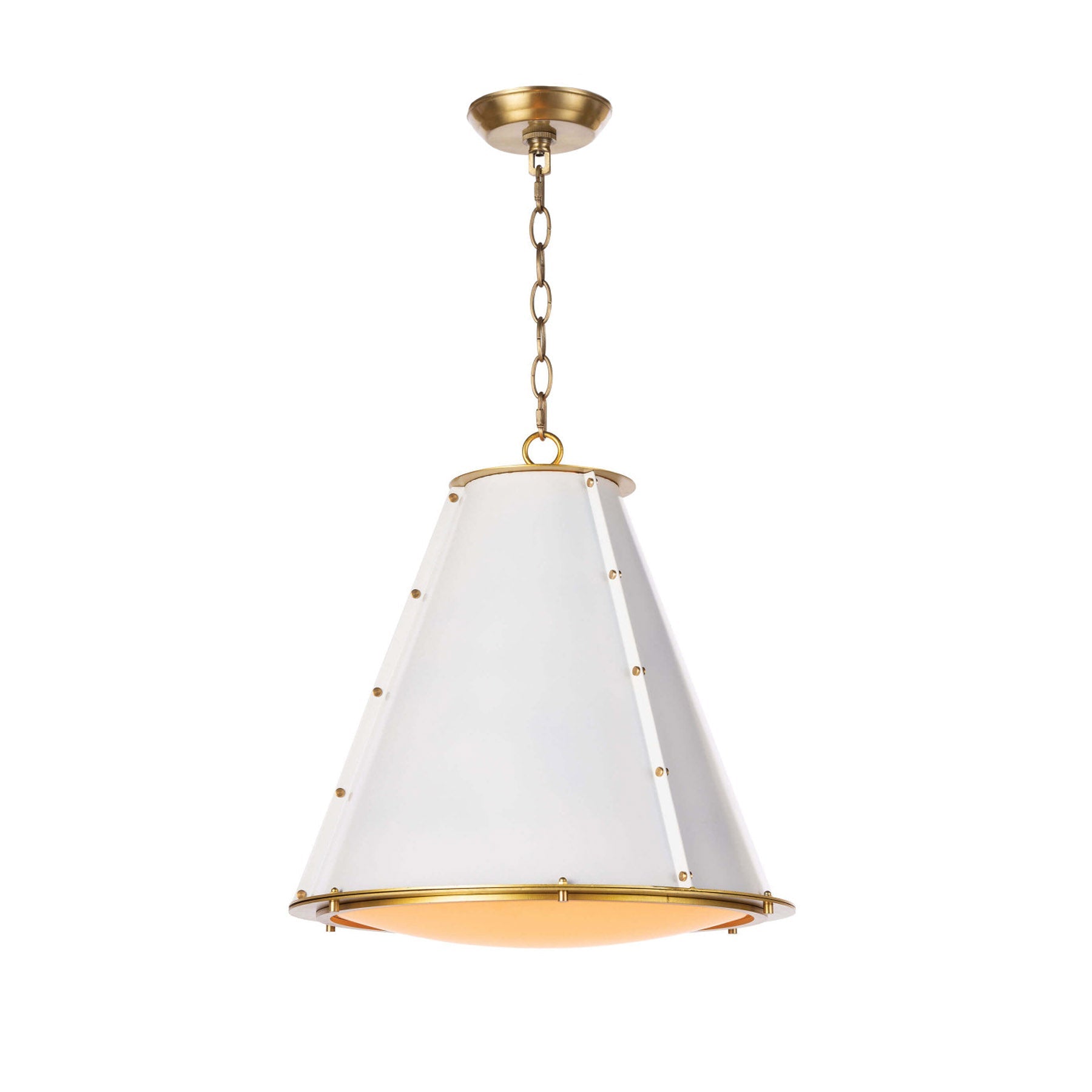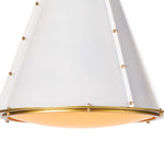 A cone silhouette is trimmed with a natural brass ring on the top and bottom of the Jolie pendant. Brass studs provide an industrial detail and a diffuser shade provides nice ambient light for a kitchen island.