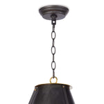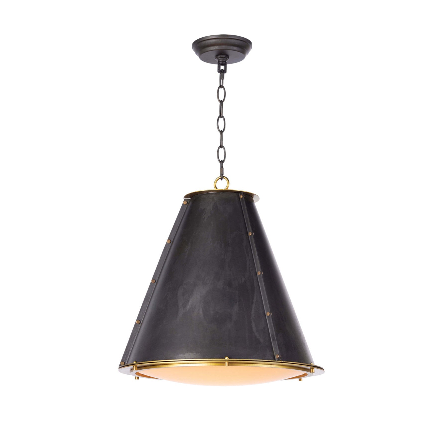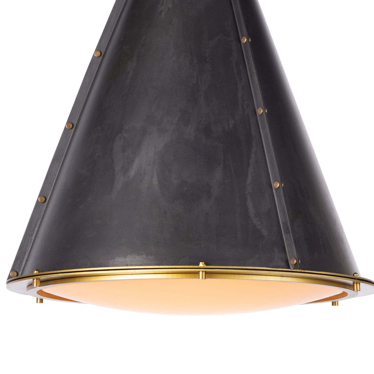 A cone silhouette is trimmed with a natural brass ring on the top and bottom of the Jolie pendant. Brass studs provide an industrial detail and a diffuser shade provides nice ambient light for a kitchen island.