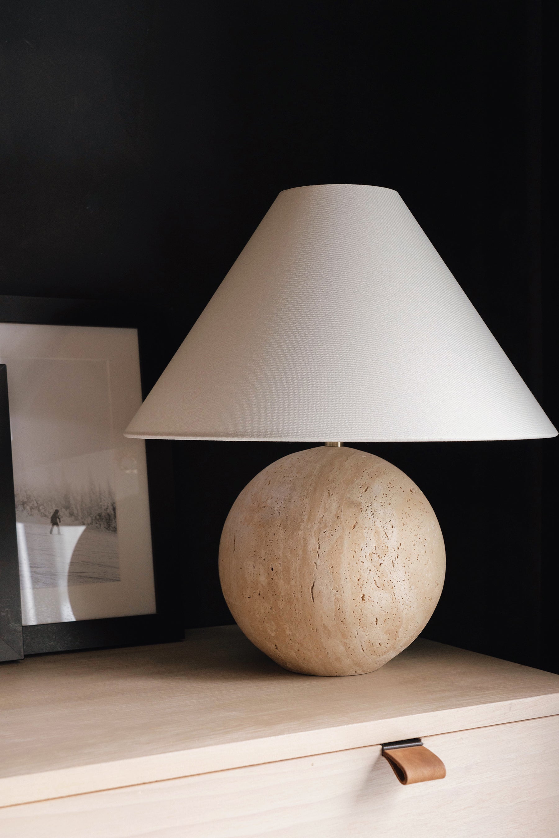 The Assen table lamp is set to become the fashionable sidekick your room update has been waiting for. Blending form and function, it features a stunning honed travertine base in tones of cream that complements many styles of interior. The perfect bedroom or living room table lamp, its generously sized tapered cream linen shade is held up by a champagne plated fitting that when combined with its included bulb, shed a warm glow throughout the room. Beautiful on its own or paired up for double duty, this dimmable lamp will make a timeless and memorable statement in any space.
