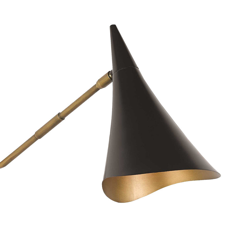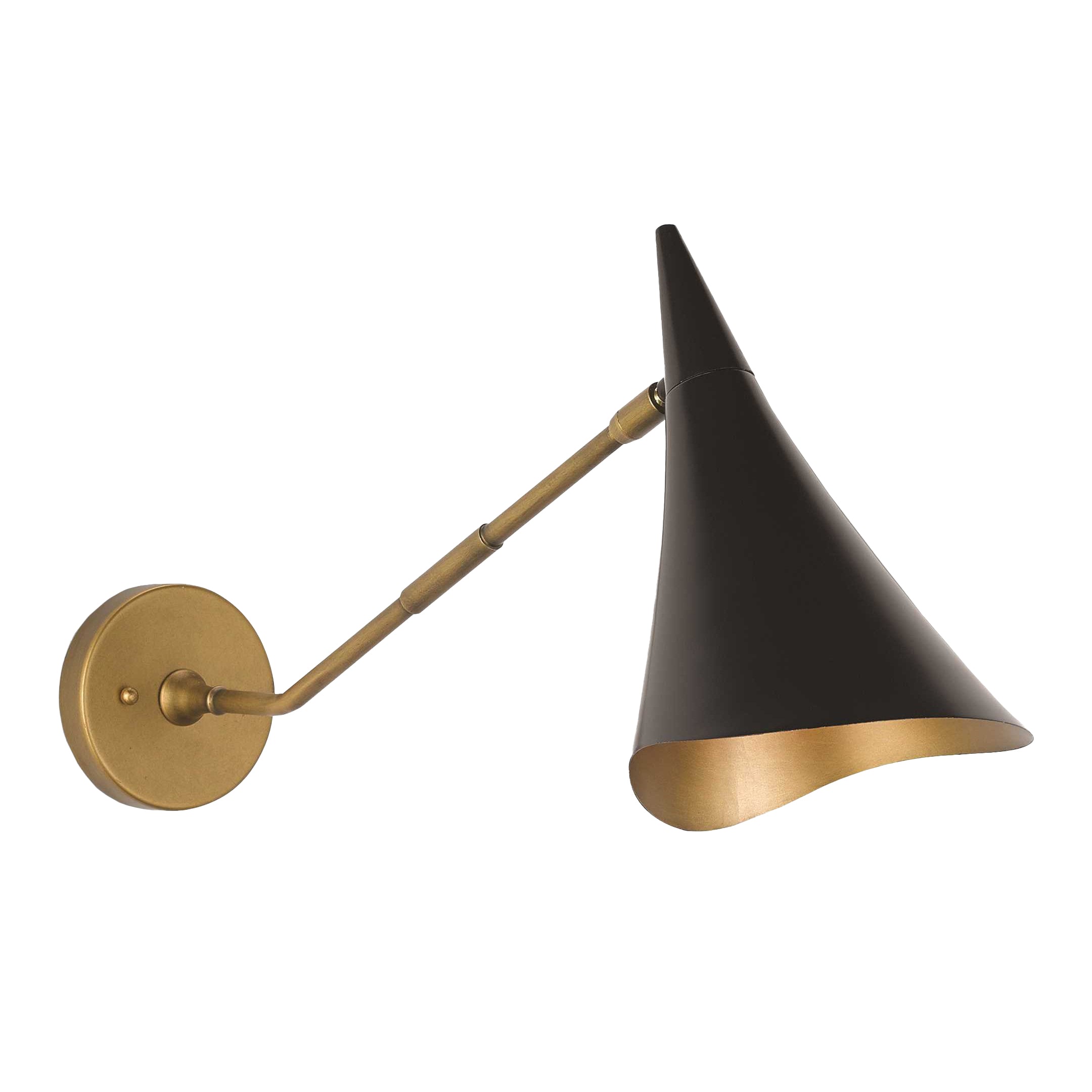 The adjustable shade of our Patricia wall sconce has an organic feel that was born during the mid-century modern boom when designers were experimenting with forms. The freedom this fixture gives you to redirect its light source and the gleaming antique brass finish on the interior of the shade makes it a wonderful reading light. The oil-rubbed bronze on the exterior of the shade makes it a handsome choice for a den or a library.