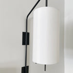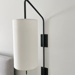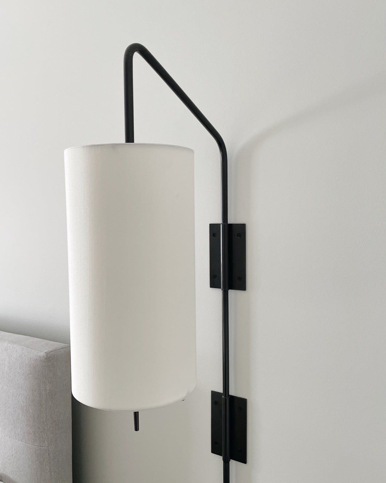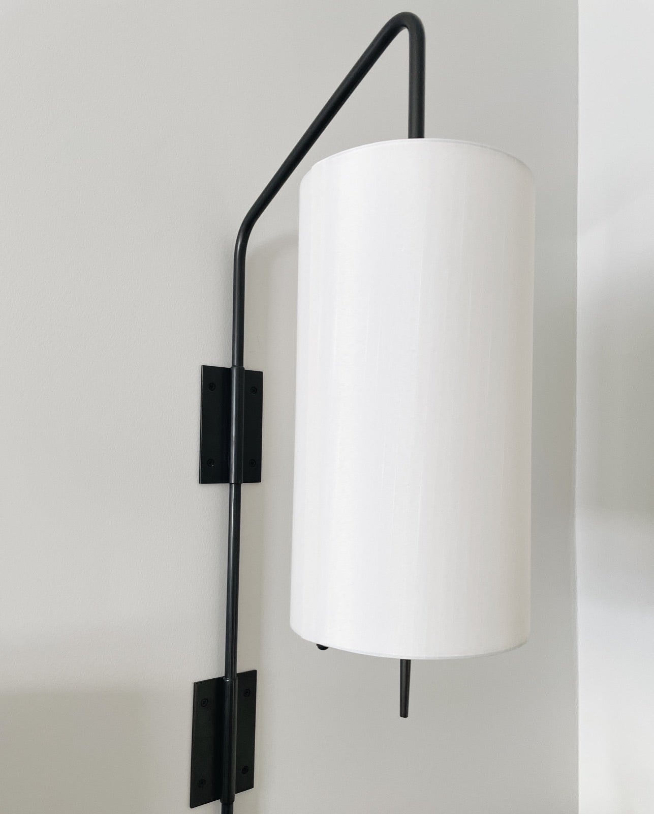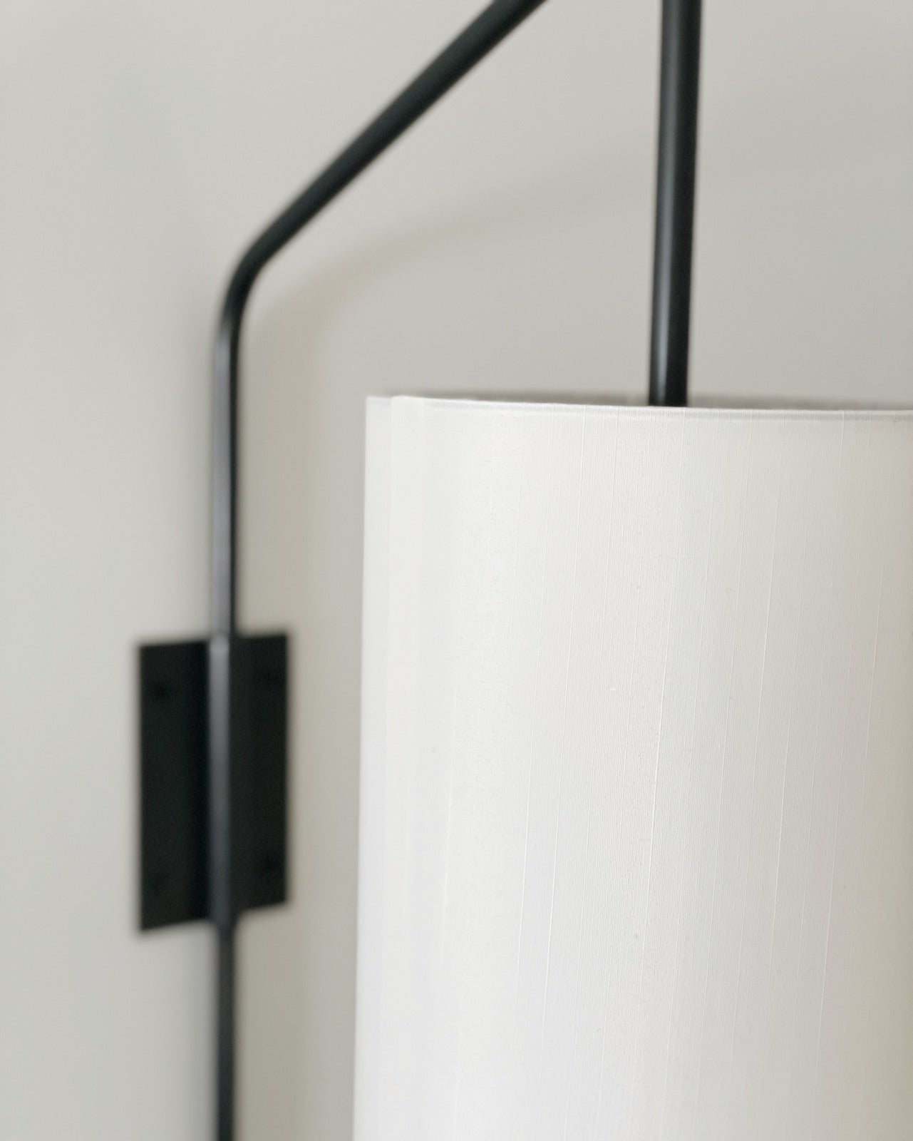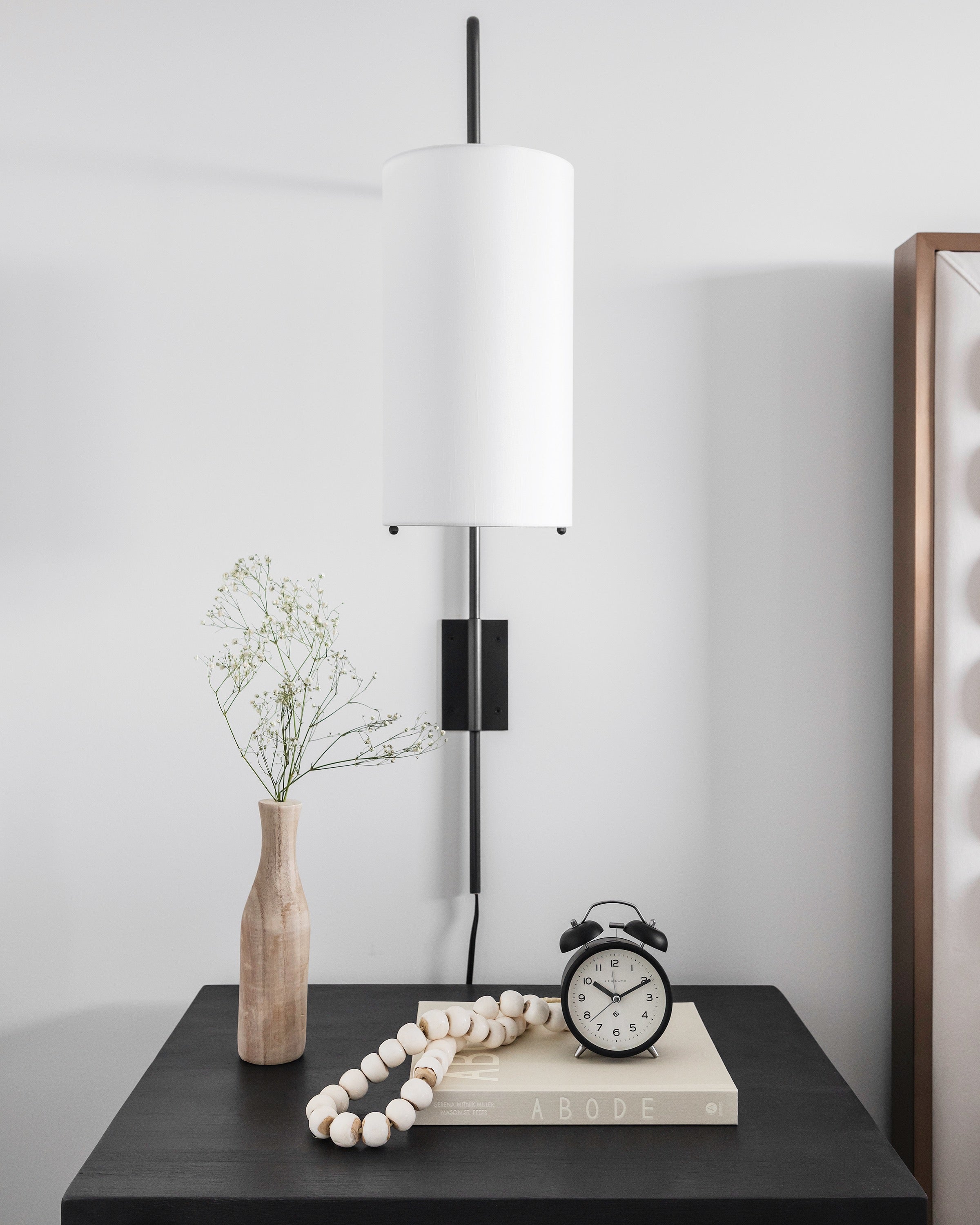 Our Tam wall sconce has an articulated armature made of metal in an oil-rubbed bronze finish. The angle of the arm that holds the bulb, the shape of the final, and the way the off-white shantung shade cleanly joins the two makes this black sconce a cohesive design with a rough luxe vibe.