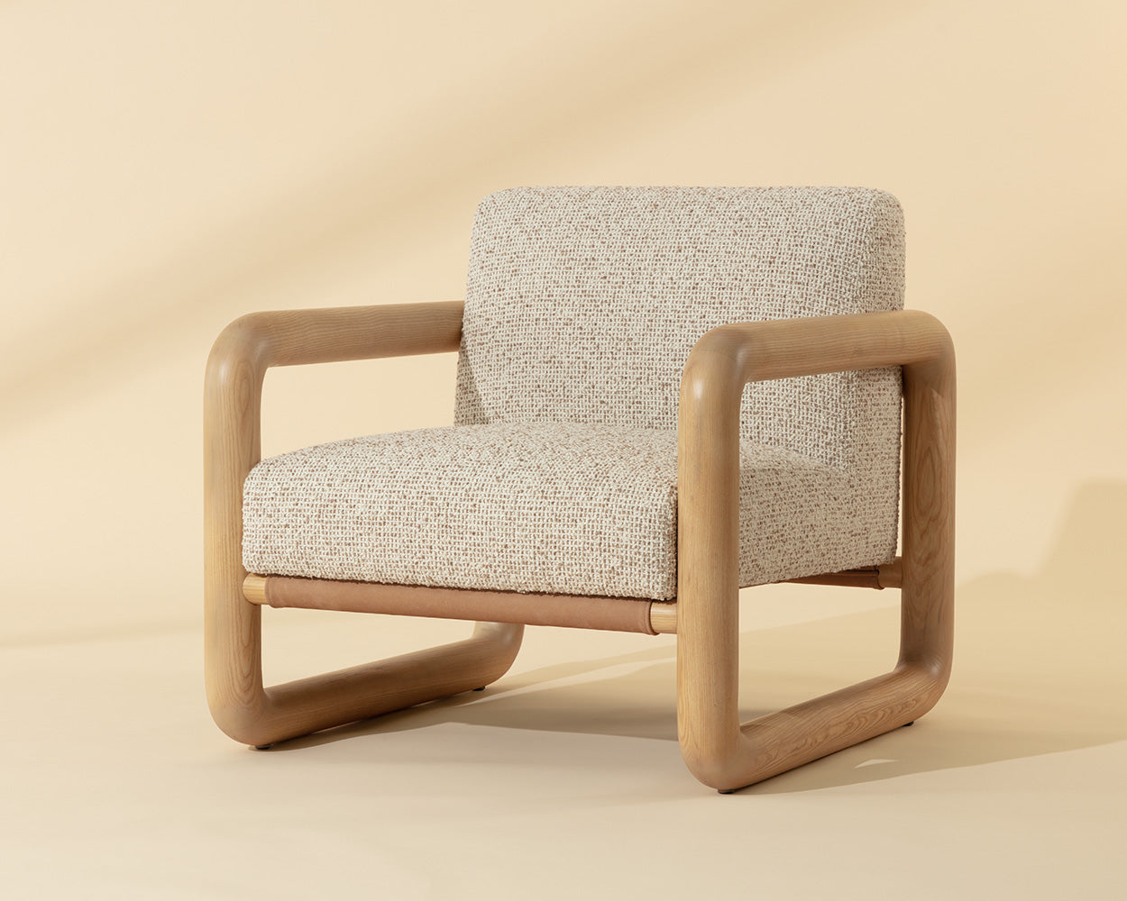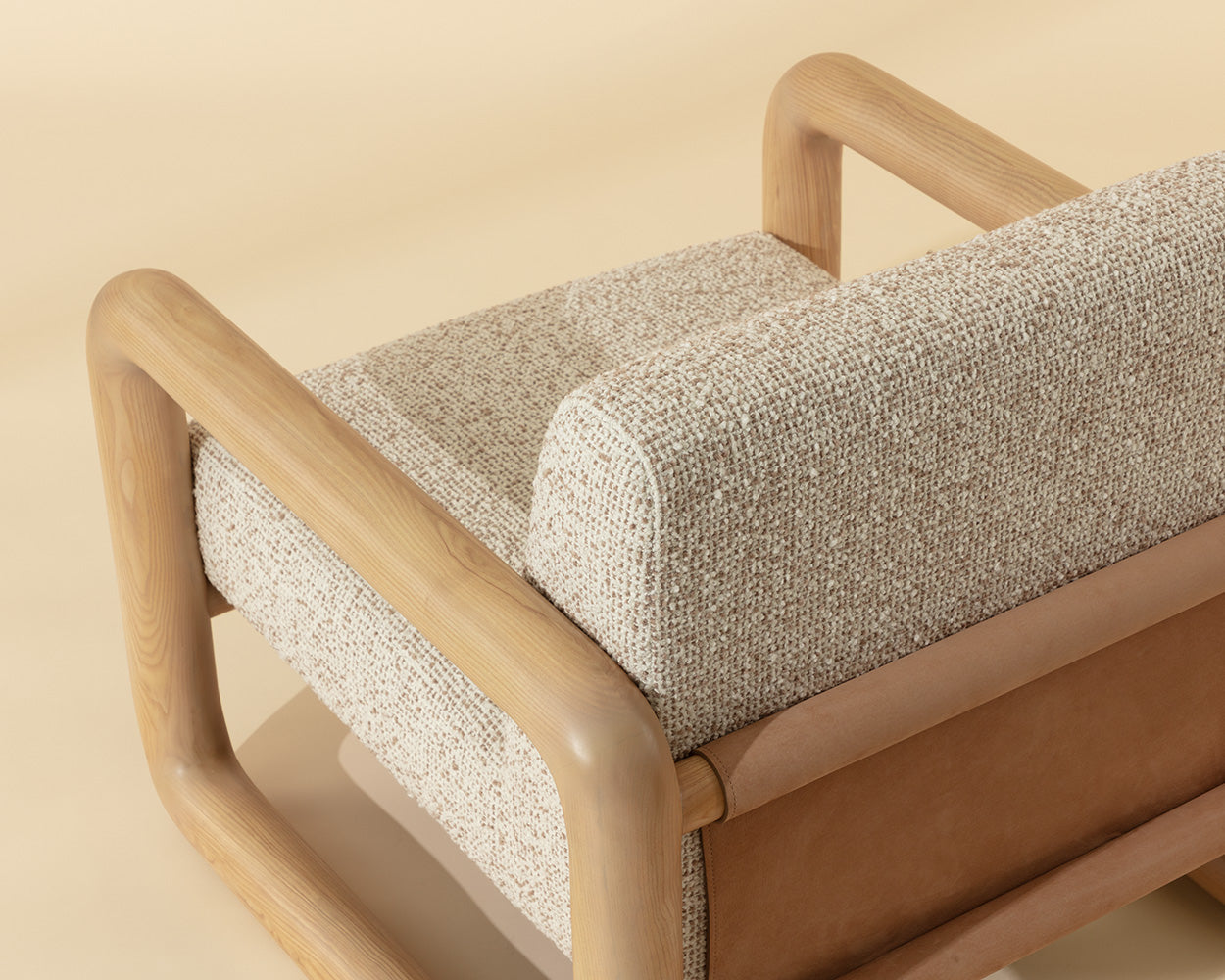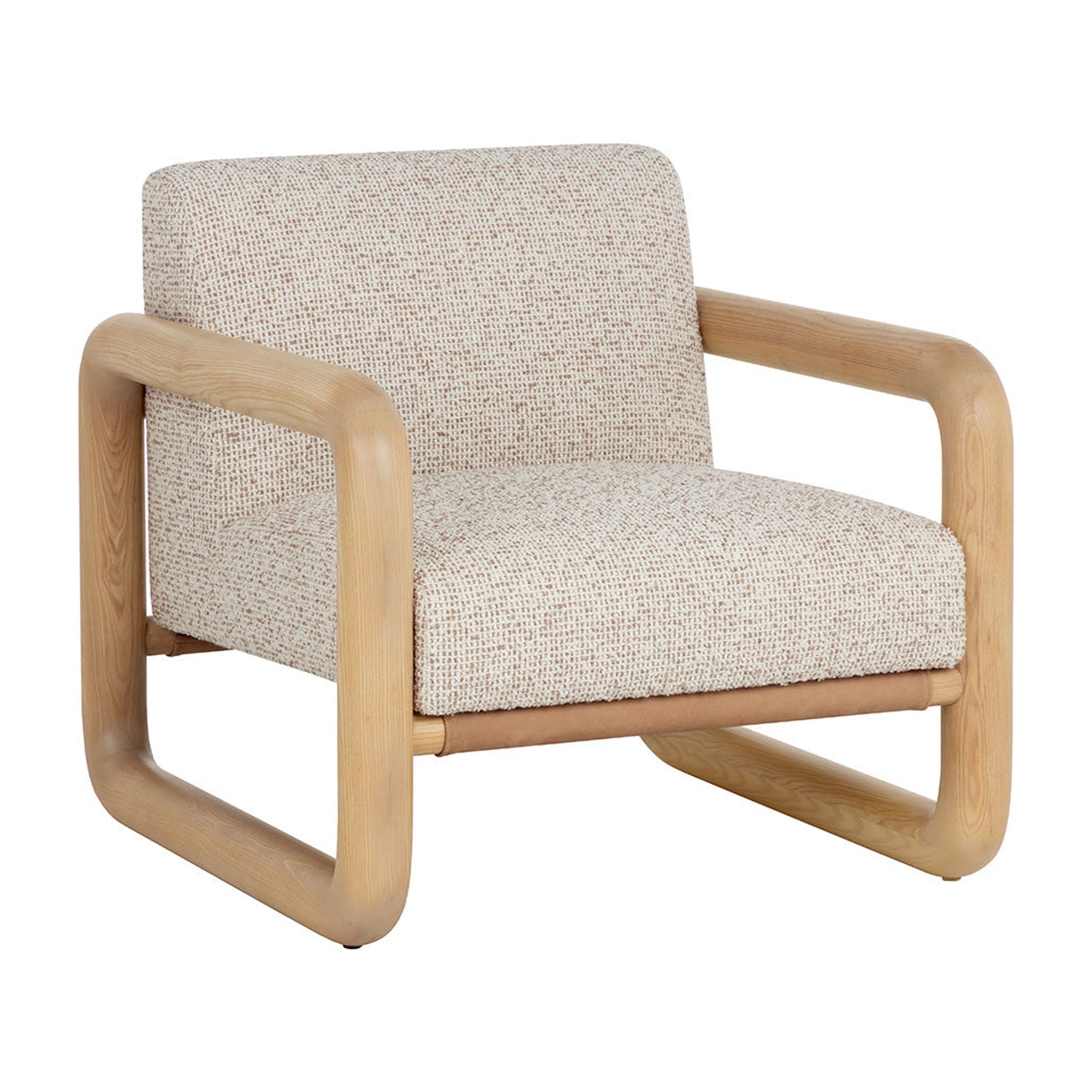 The Bueno Lounge Chair is made for moments of pause. Its solid ash wood frame flows in a continuos loop with soft, radiused corners. A broad seat upholstered in textured noah ecru fabric feels generous and inviting, while panels of nubuck tan leather stretch across the back and base, adding a tactile contrast that gives the chair its relaxed character.