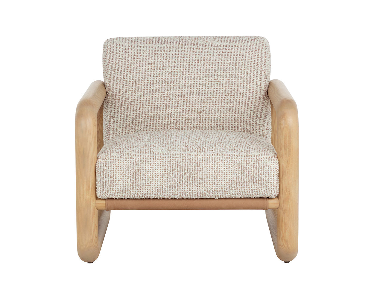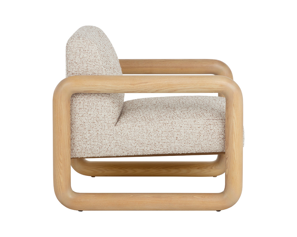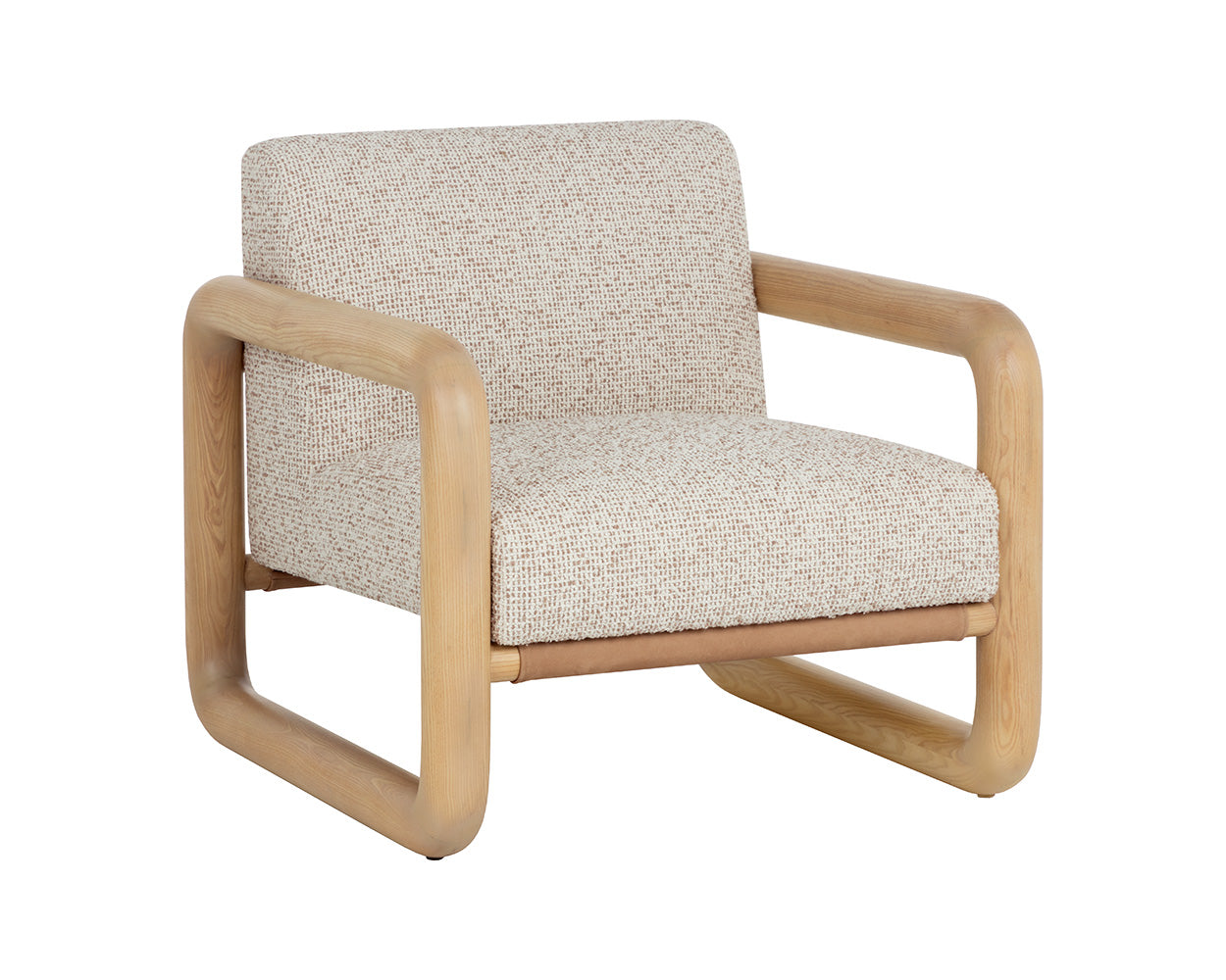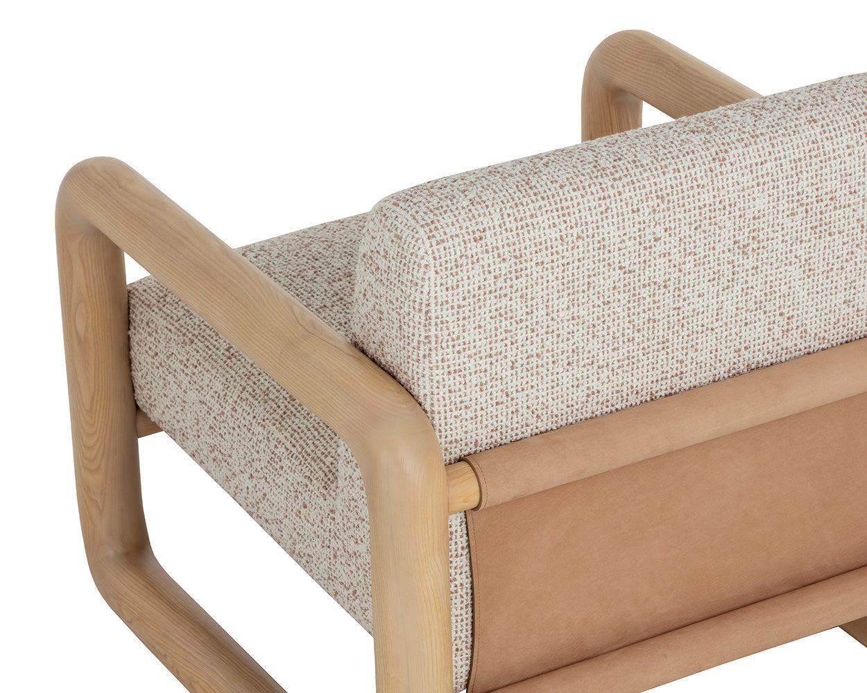 The Bueno Lounge Chair is made for moments of pause. Its solid ash wood frame flows in a continuos loop with soft, radiused corners. A broad seat upholstered in textured noah ecru fabric feels generous and inviting, while panels of nubuck tan leather stretch across the back and base, adding a tactile contrast that gives the chair its relaxed character.