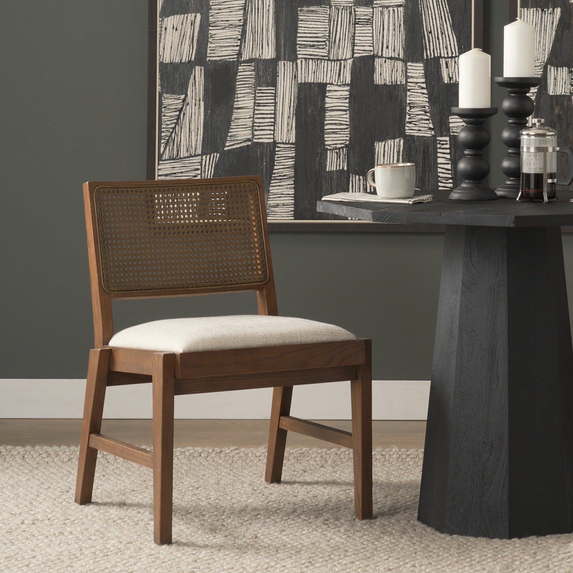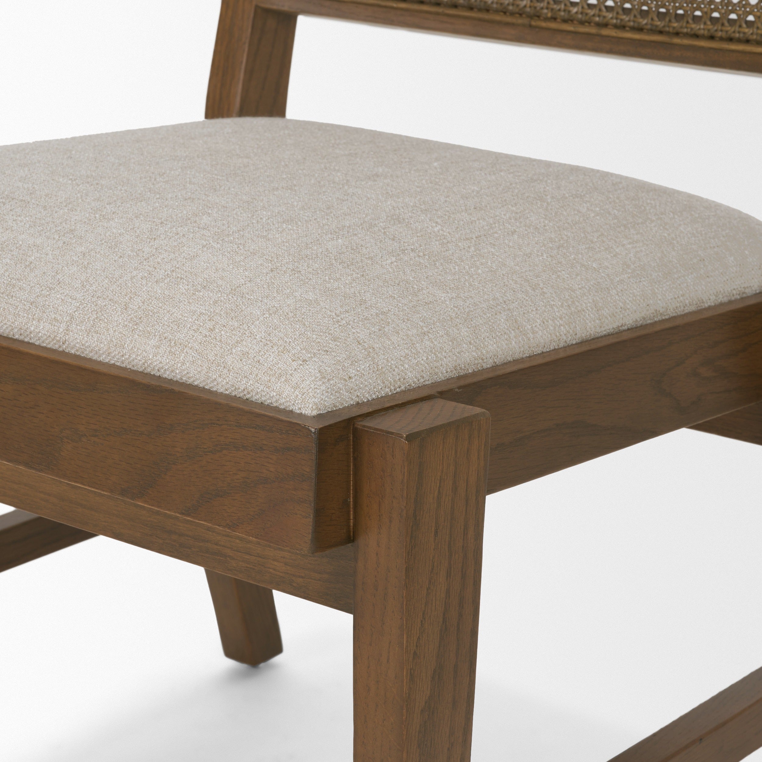 A refined nod to mid-century craftsmanship, the Franko dining chair blends warmth and elegance with its solid oak frame in a rich brown finish. The handwoven cane back adds airy texture and artisanal charm, while the plush cream linen-blend seat offers tailored comfort and everyday durability. Perfectly balanced in profile and proportion, this chair elevates any dining setting with timeless character and ease.