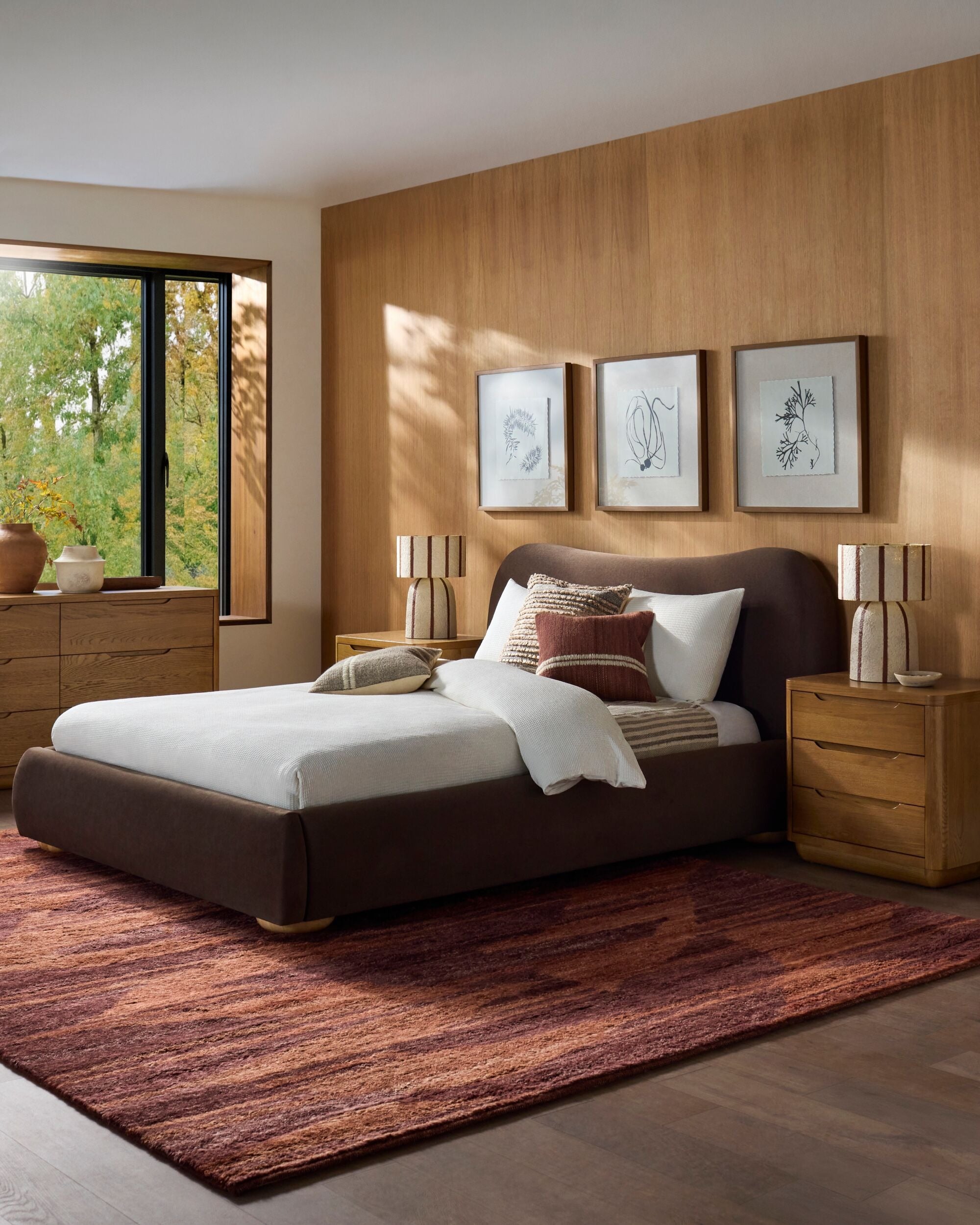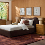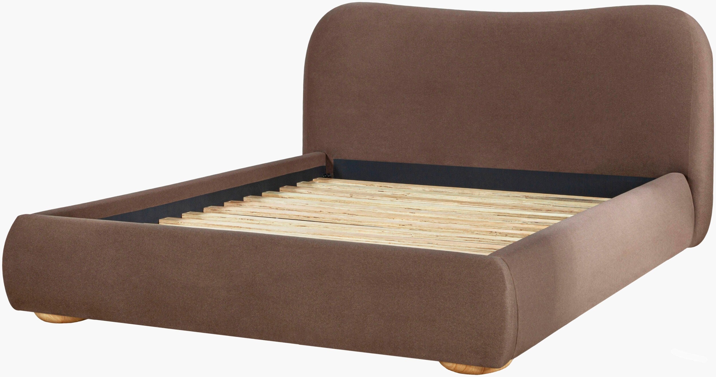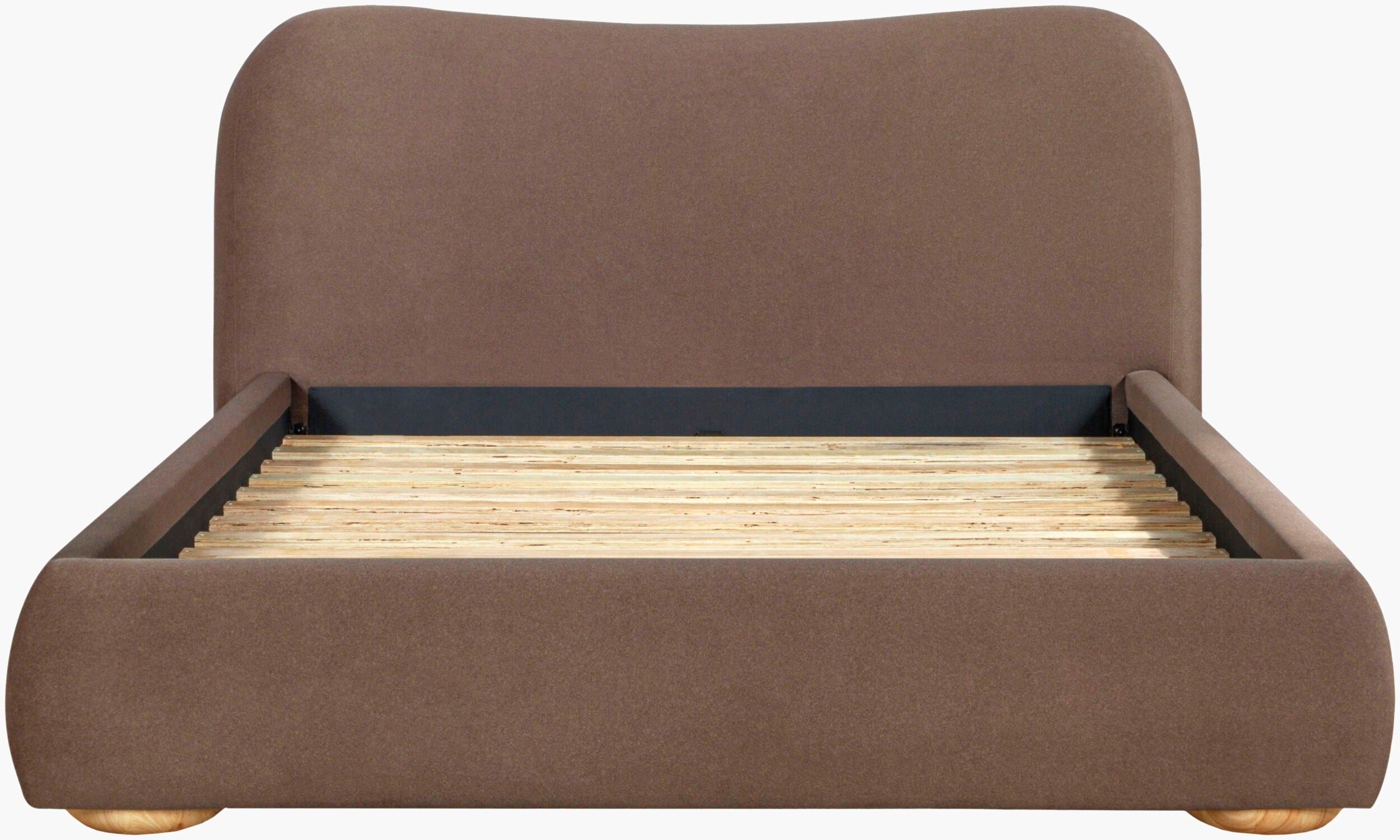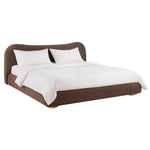 Soft curves meet quiet sophistication in this statement bed. Upholstered in a rich faux mohair, its sculptural silhouette brings a sense of calm luxury to the bedroom while remaining inviting and approachable. The gently rounded headboard and low, grounded profile create a cocoon-like feel that’s perfect for slow mornings and early nights.